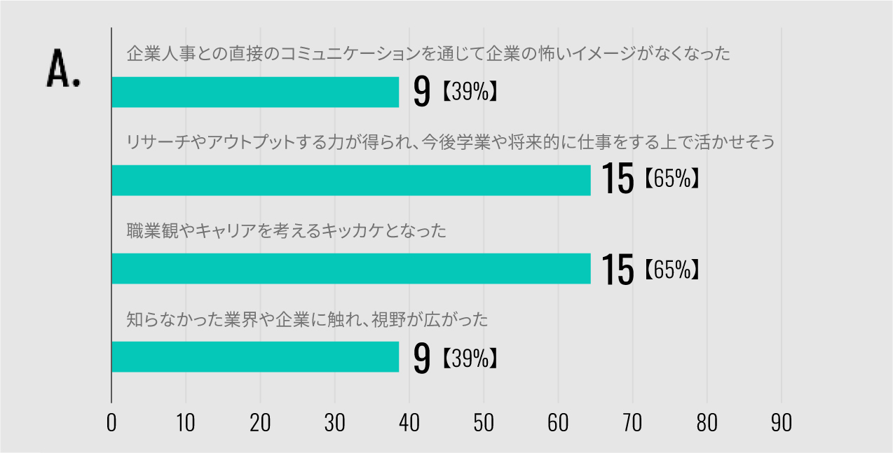 - Q.プロジェクト全体を通じて・また早期に企業と直接接点を 持てたことで、今後皆さんにとってどんな点で 役に立ちそうか(複数回答可)