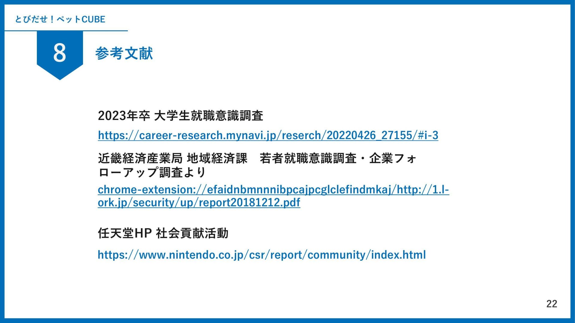 - 今後、就職先を考える上でリサーチする点やプレゼンをする機会がある際のまとめ方を、評価・他チームの発表などからたくさん学ぶことがありました。