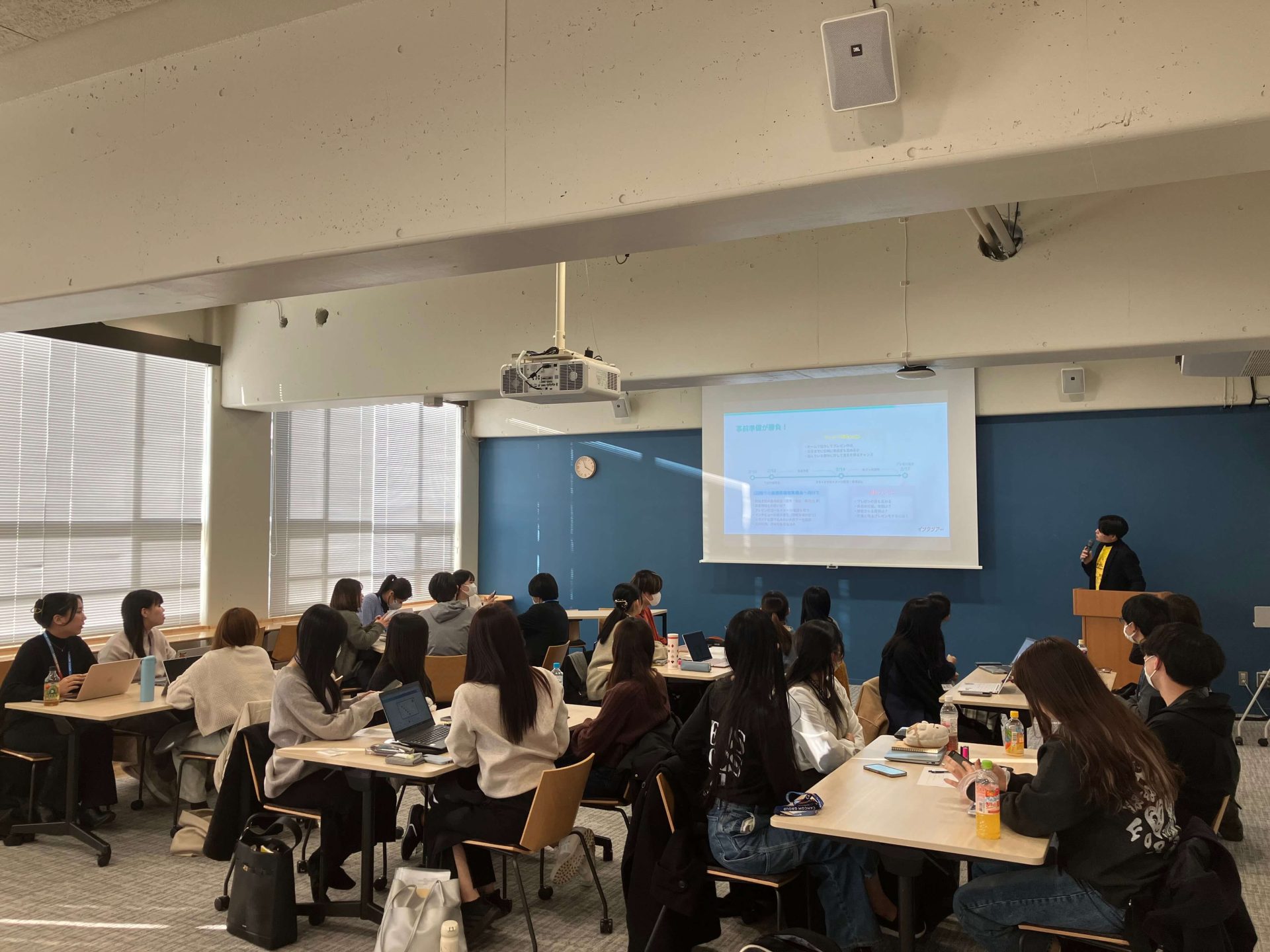 プレゼンテーションの準備・発表に向けて、企業リサーチ、インタビューやプレゼンテーションなどのレクチャーの機会があったことや、企業の人事担当者へのインタビューを通じて自分たちの知りたいことを直接聞けたことなど、インプット面の充実がその理由に挙げられると思います。参加者全員がプレゼンテーションの内容を評価し優勝チームを決定する、というプロセスも納得感・満足感に繋がったのではないでしょうか。